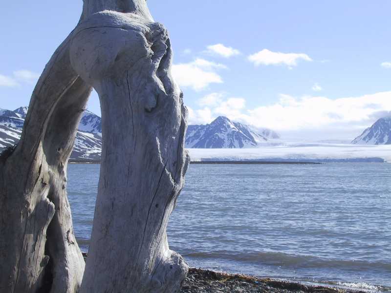 Die Sonne hat sich komplett hinter dichten Wolken versteckt, als wir um 2 Uhr zur Bärenwache, geweckt werden. Die 2 Stunden verbringen wir damit, die Hände am Lagerfeuer zu wärmen. Immer wenn die Sonne hinter Wolken verschwindet, kommt mit großer Regelmäßigkeit der eiskalte Wind. Gegen Ende der Wache fängt es sogar leicht zu nieseln an. Wir kriechen wieder ins Zelt und schlafen noch ein paar Stunden. Es ist kalt, windig und nieselt immer noch leicht beim Aufstehen. Das Termometer zeigt 2 Grad, es fühlt sich ohne Sonne und mit viel arktischem Wind wie -10 Grad an. Nach dem Frühstück bilden sich zwei Gruppen, 5 "Fastrunners" (darunter Thomas und ich) wollen einen prachtvollen Gletscher aus der Nähe besichtigen. Die über 25 km Fußmarsch lohnen sich. Wir bringen gelungene Photos von dem Gletscher nach Hause. Eine zutrauliche Möwe versucht, Teile unsere Lunches zu erbetteln und läßt sich aus wenigen Zentimetern Entfernung furchtlos photographieren.