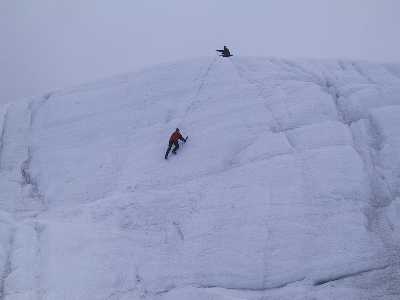 Da das Wetter nicht mit viel Sonne aufwarten kann, wird der Aufbruch zunächst verschoben. Bei dichter Bewölkung werden wir noch einmal den Gletscher betreten und uns auch im Iceclimbing versuchen. Gut gesichert ist dies das reinste Vergnügen, es ist kaum anstrengender als Treppensteigen. Man rammt die zwei Eispickel in das Gletschereis und setzt mit den Füßen (Steigeisen) nach. Dabei kann man durchaus eine respektable Geschwindigkeit erreichen.